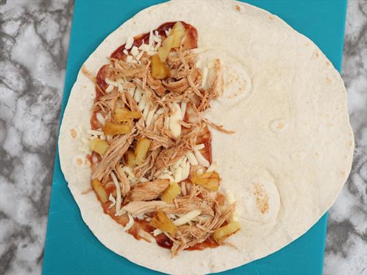 Dreifið osti, kjúkling, ananas og bbq sósu (og jalapeño ef fólk vill hafa þetta sterkt) á helming kökunnar og brjótið kökuna saman í hálmána.